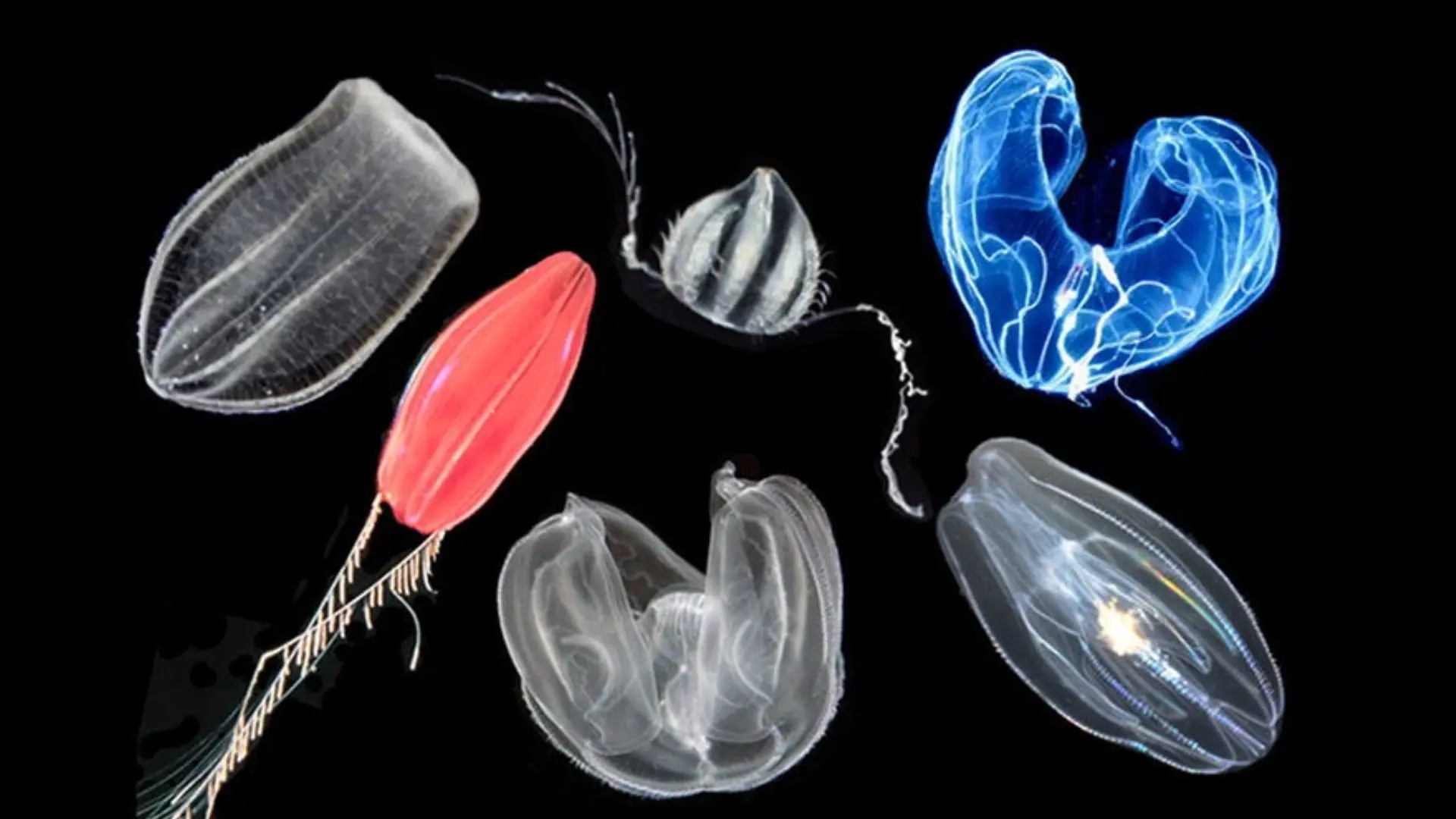 Ctenophores | Image Source : Wikipedia | Image By : Beroe ovata, Euplokamis sp., Nepheloctena sp., Bathocyroe fosteri, Mnemiopsis leidyi, and Ocyropsis sp. (CC0)
